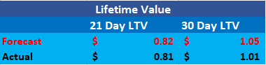 When we look at the difference between the forecasted and actual LTV values, we can see that the gap between the forecast and actual is smaller with the 21-day forecast than it is with the 30-day forecast. This highlights a commonly known limitation to forecasting which is; your short-term forecasts will be more accurate than your long-term forecasts. There are several reasons for this is the case and we’ll cover them in future posts. For now, just keep in mind that the further out your forecasts are, the less accurate they’re going to be.